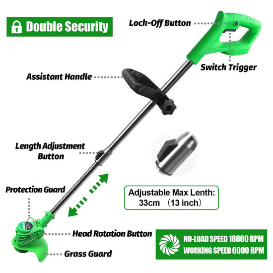 This grass cutter is equipped with a powerful pure copper motor (UP TO 600W), so you don’t need to worry about the lack of power, we provide you with two batteries (one battery for a single charge, It can be used for about 1 hour 30minutes, please fully charge the battery first when you get our package), which can keep you working efficiently without waiting for charging.